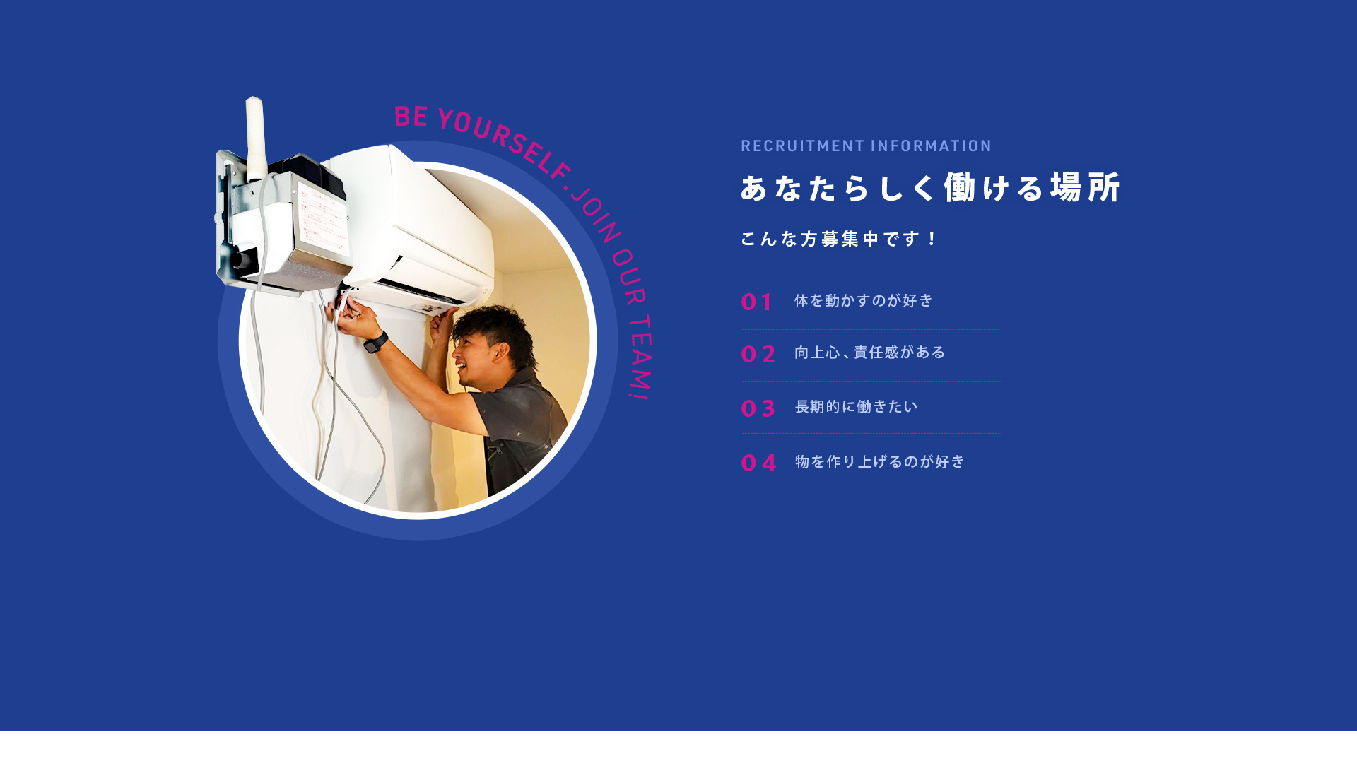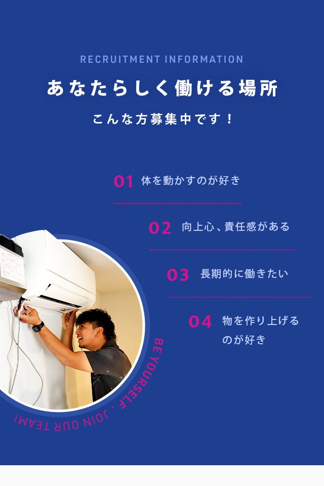 空調設備工事のお仕事はスタートが簡単です。専門知識や特別なスキルは必要ありません。実際に働きながら習得していきましょう。ただし「約束の時間を守る」「元気よく挨拶できる」といった、社会人として最低限必要な心構えは持っていただきたいです。逆に「自分には自信がない…」という方も、これを機に私たちと一緒に頑張ってみませんか?